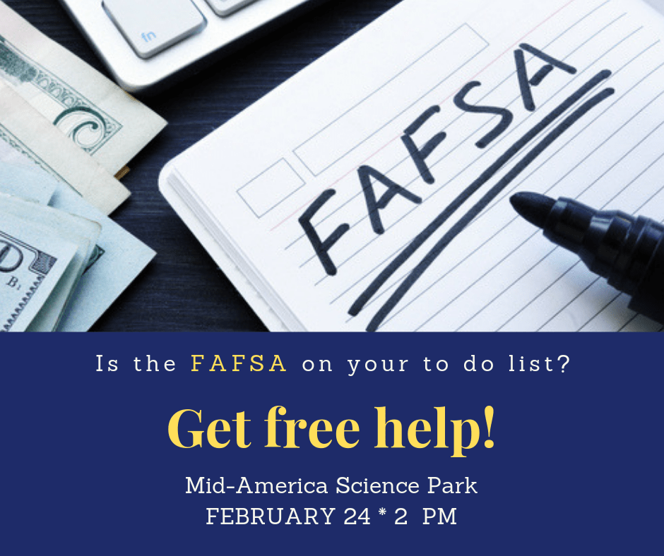 The FAFSA application deadline for Indiana state grant programs is April 15. Get free help filing at College Goal Sunday, February 24 at 2 p.m., at the Mid-America Science Park in Scottsburg. Here’s a list of what you need to bring. The Mid-America Science Park is located at 821 S. Lake Road South, Scottsburg, IN 47170.