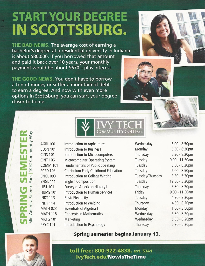 If you know someone who is interested in pursuing a bachelor’s degree, be sure to let them know that Ivy Tech is offering several courses in Scottsburg. The spring semester starts January 13! For more information, visit IvyTech.edu/NowIsTheTime or call toll free (800) 922-4838, ext. 5341.